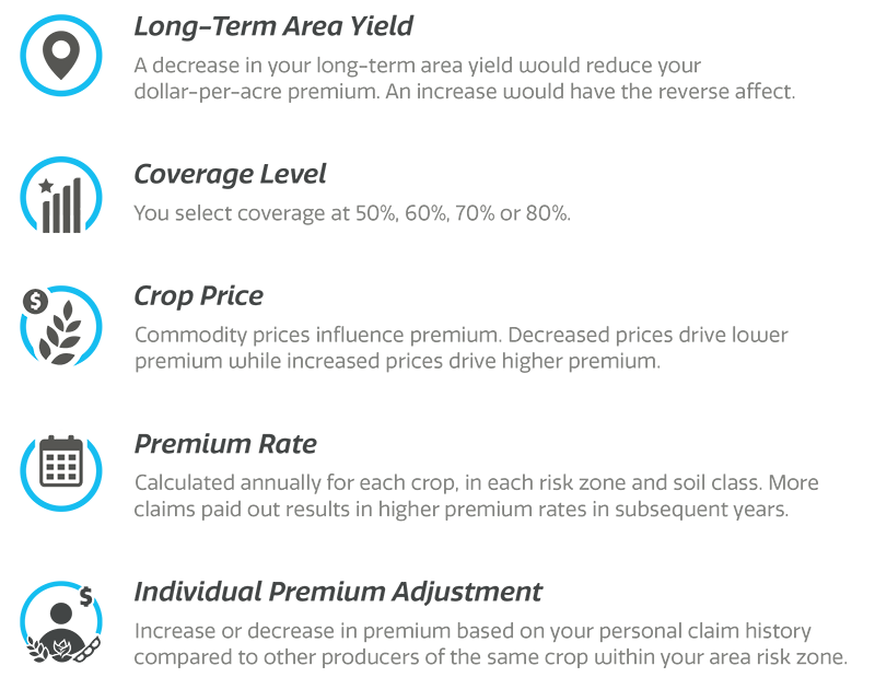 Premium for multi-peril Crop Insurance coverage includes your Long-Term Area Yield, selected coverage level, crop price, premium rate and your Individual Premium adjustment. Premium is only charged on the actual acres seeded and selected to insure. You may endorse all crops and if you do not grow them, premium is not charged.